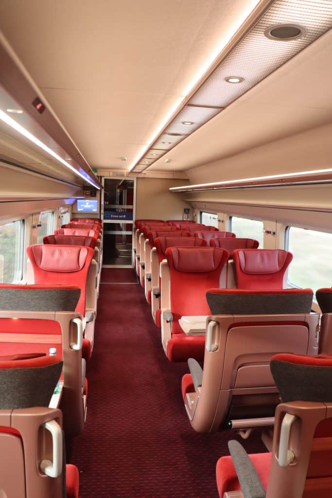 So müssen wir leider an den ganzen französischen Schönheiten (damit sind natürlich die Züge gemeint) vorbeihuschen und rasen direkt zu unserem Gleis, wo auch schon unser weinroter TGV wartet. Sogar, zu unserem Glück ein frisch modernisierter Zug. Vorher bekannt als Thalys Ruby, jetzt wahrscheinlich Eurostar Ruby.